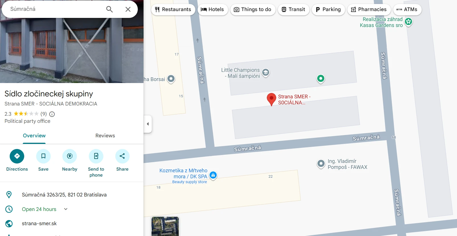 Strana Smer-SD čelí na Google Maps zaujímavej situácii. Niekto jej centrálu na Súmračnej ulici v bratislavskom Ružinove na Google Maps premenoval na „Sídlo zločineckej skupiny“. Tento názov je stále voľne dostupný a ak si na mapách dáte vyhľadať centrálu Smeru, Google vám ukáže práve toto pomenovanie.