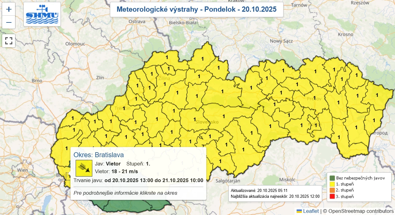 Na území Bratislavského kraja si dávajte pozor na silný vietor. Slovenský hydrometeorologický ústav (SHMÚ) vydal výstrahy prvého stupňa pre okresy: Bratislava a Malacky. V okresoch Senec a Pezinok zatiaľ výstraha neplatí. od 20.10.2025 13:00 do 10:00 utorkového rána.
