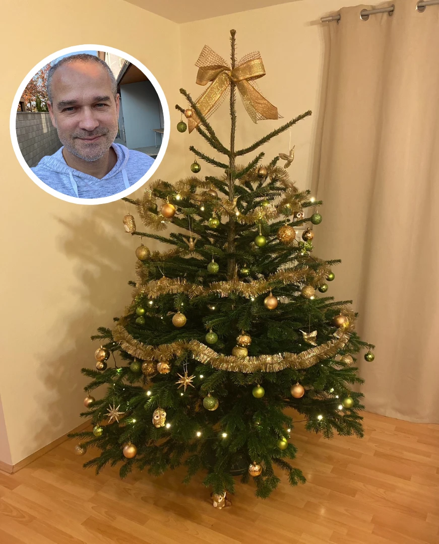 Stromček máme už dlhé roky umelý – snažíme sa chrániť prírodu – takže každý rok sa tam jedine upraví trochu výzdoba.