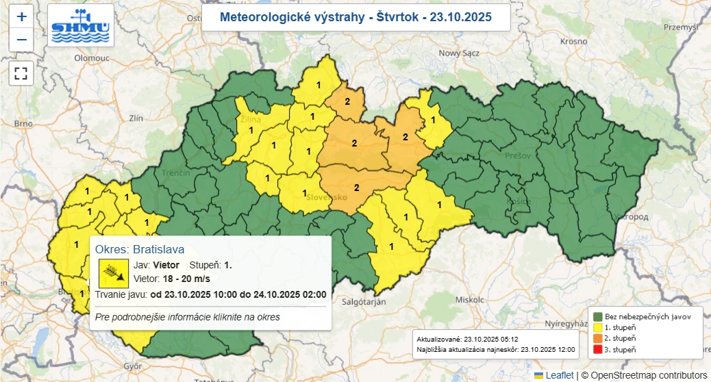 Na území Bratislavského kraja si dávajte pozor na silný vietor. Slovenský hydrometeorologický ústav (SHMÚ) vydal výstrahy prvého stupňa pre všetky okresy: Bratislava, Senec, Pezinok a Malacky. Výstraha platí od 23.10.2025 10:00 do 02:00 piatkového rána.