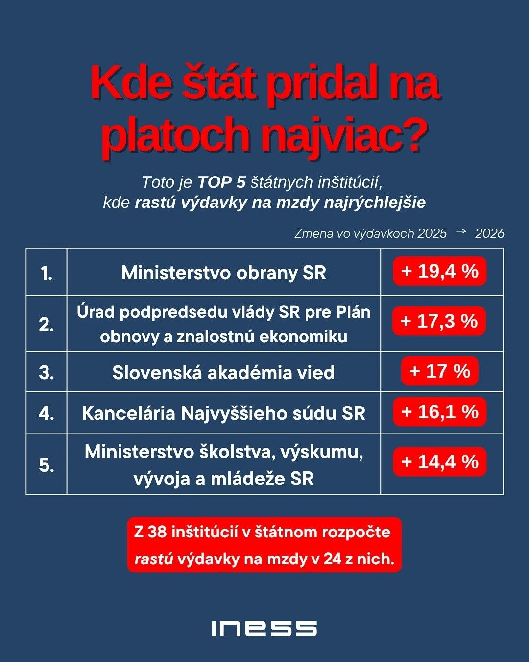 Pre mnohých živnostníkov a zamestnancov znamenal rozpočet pre rok 2026 zvýšenie odvodov. Kým vláda verejne hovorí o prepúšťaní na rezortoch, v schválenom návrhu sa nachádza aj niečo prekvapivé. Inštitút INESS upozornil, že si štát namiesto uťahovania opaskov na platoch dopraje ešte viac. Z 38 inštitúcií v štátnom rozpočte rastú mzdy v 24 z nich.