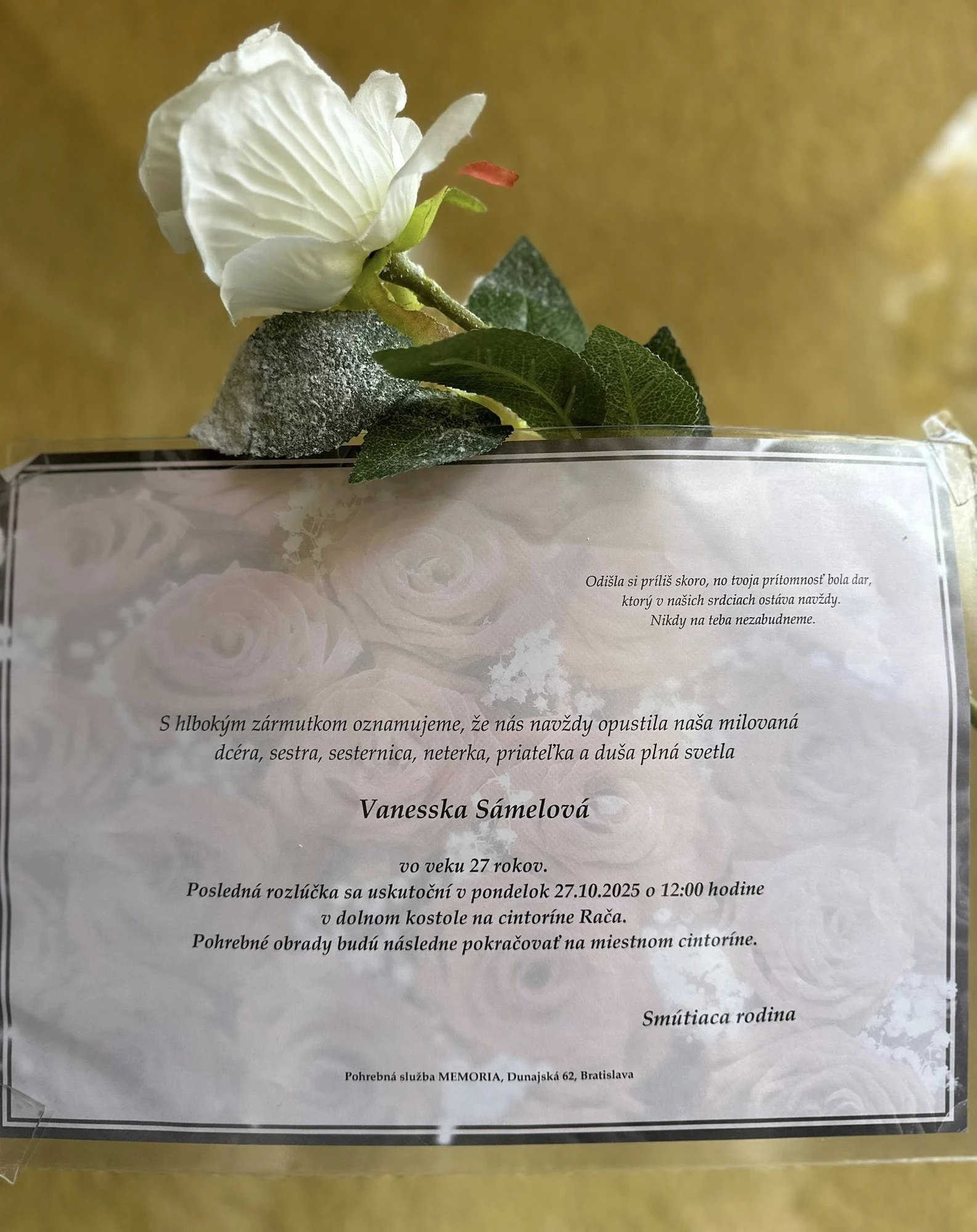 „Milí Račania, chceli by sme dať na vedomie tým, ktorí poznali a mali radi Vanessku, že posledná rozlúčka sa uskutoční zajtra, 27. októbra 2025 o 12:00 na Cintoríne Rača,“ uviedla jej rodina.