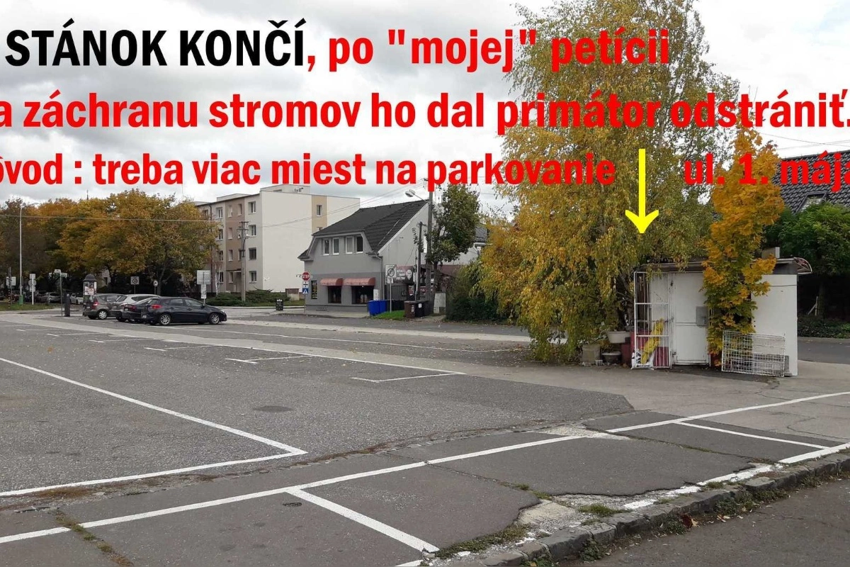 Vladislav pripojil aj fotografiu parkoviska s poznámkou, že po zrušení stánku pribudnú najviac dve parkovacie miesta, ktoré podľa neho „nič nezachránia“. Zároveň tvrdí, že mesto plánuje vyrúbať aj tých niekoľko stromov v okolí.