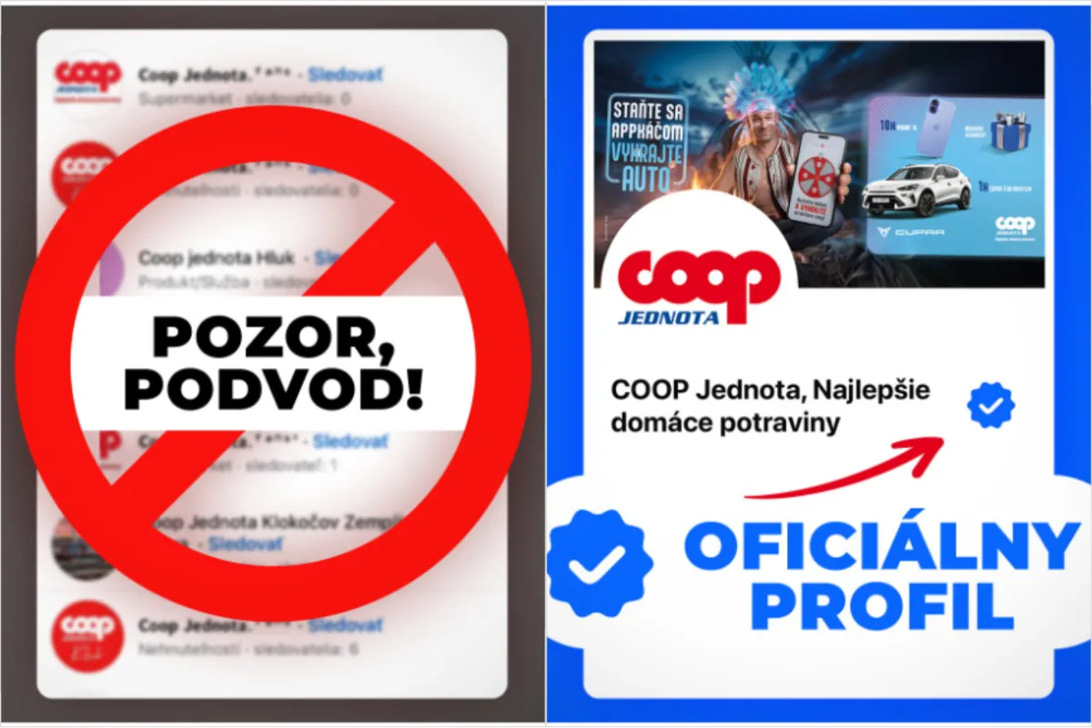 Slovenský reťazec COOP Jednota varuje verejnosť pred nebezpečnými falošnými profilmi na sociálnych sieťach, ktoré sa neoprávnene vydávajú za ich oficiálnu značku. Podvodníci zneužívajú známe logo a názov spoločnosti, aby ľudí nalákali do falošných súťaží o „atraktívne ceny“.