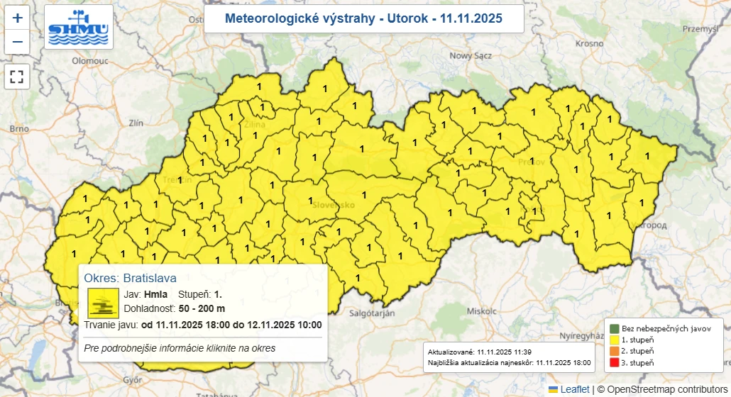 Bratislavský kraj čaká v najbližších hodinách nepríjemné počasie. Slovenský hydrometeorologický ústav (SHMÚ) vydal výstrahu 1. stupňa pred hmlou, ktorá platí od utorka 11. novembra od 18:00 do stredy 12. novembra do 10:00 vo všetkých okresoch Bratislavského kraja.