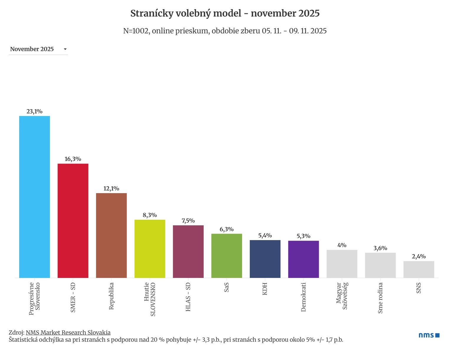 Podľa najnovšieho prieskumu agentúry NMS Market Research Slovakia pre by voľby v novembri 2025 vyhralo Progresívne Slovensko. Strana získala 23,1 percenta hlasov, čím si upevnila prvé miesto a potvrdila dlhodobý trend rastu.