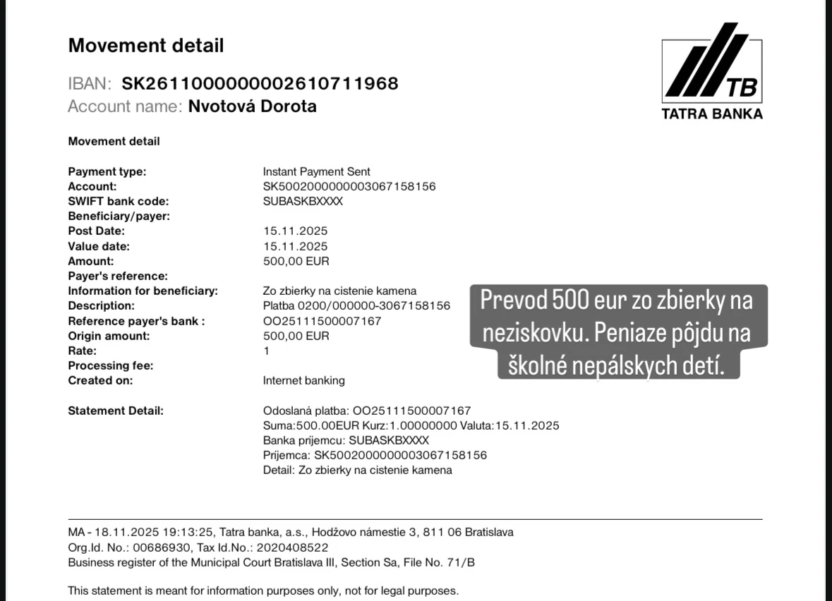 Zvyšných 500 eur tak odišlo na vzdelávanie nepálskych detí, o ktoré sa podľa jej slov stará dlhé roky. „O tie decká sa starám od ich útleho detstva. Hovoria mi mama, a urobila by som pre nich prvé posledné.“
