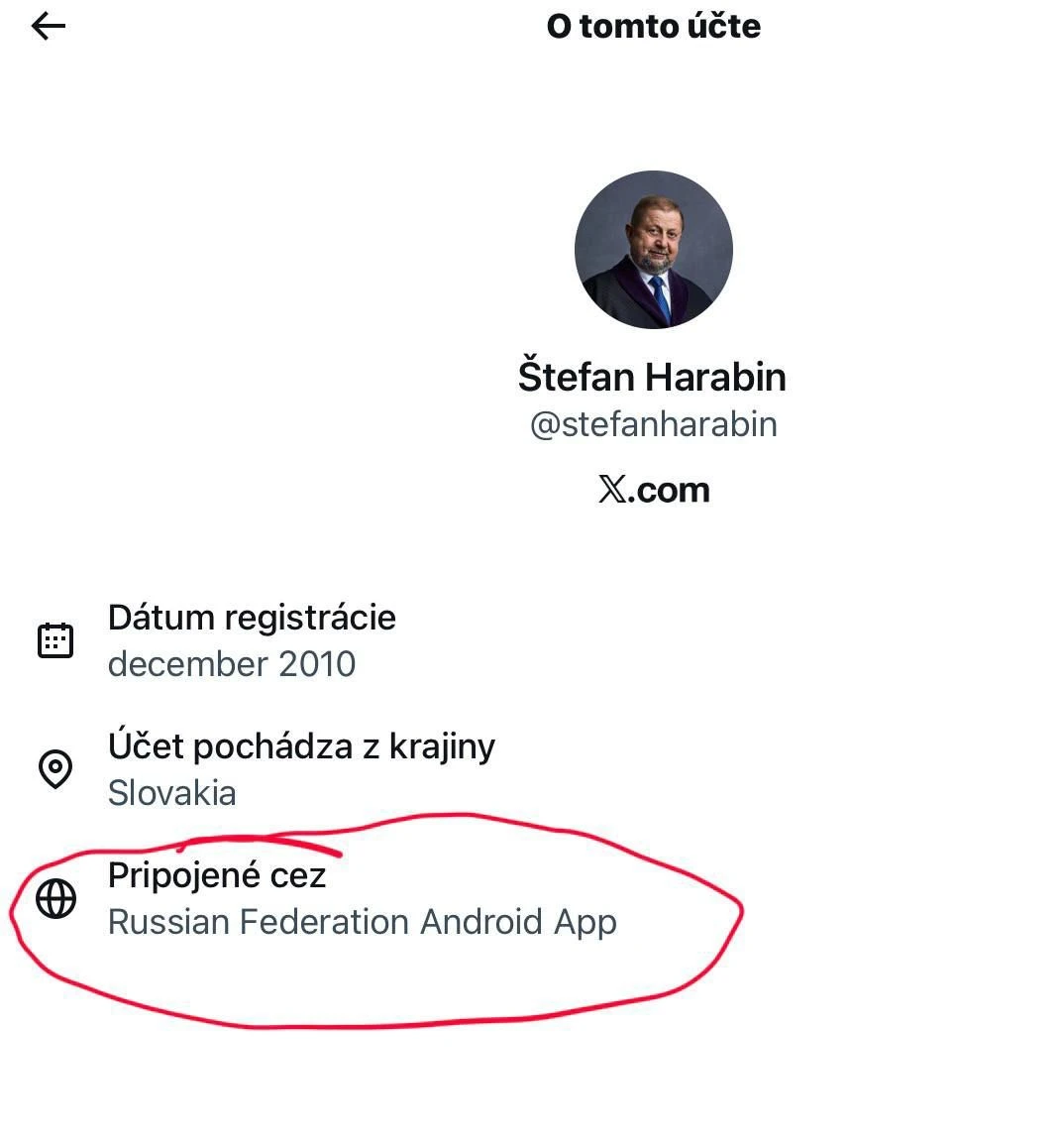 Sociálna sieť X (bývalý Twitter) umožňuje používateľom vidieť, odkiaľ je účet pripojený. Na profile bývalého sudcu a ministra Štefana Harabina sa objavil údaj, podľa ktorého sa v uplynulých dňoch niekoľkokrát pripojil priamo z Ruskej federácie. To vyvolalo podozrenia, že jeho účet môže byť spravovaný z Ruska.