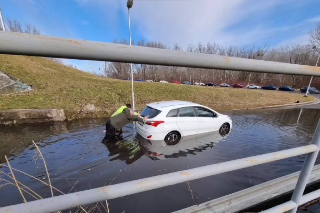 Ten sa z po kolená hlbokej vody snažil vytlačiť biely osobný automobil. Keď to uvidel policajt, neváhal a vydal sa mu na pomoc. Ešte predtým si však vyzul topánky a ponožky, položil ich na neďaleký obrubník, vyhrnul si nohavice a vybral sa do chladnej vody.
