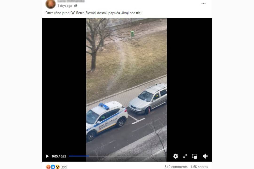 Mestská polícia Bratislava upozorňuje na nepravdivý príspevok, ktorý sa šíril slovenským internetom v piatok 2. februára. Ide o video zobrazujúce mestských policajtov, ktorí pred obchodným domom v Ružinove dávajú papuču dvom vozidlám so slovenskými poznávacími značkami. Podľa autorky videa vozidlo s ukrajinskou značkou však odignorovali.