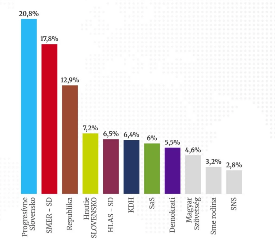 Na druhom mieste by skončila strana Smer-SD so ziskom 17,8 percenta opýtaných. Tretie miesto by obsadilo mimoparlamentné hnutie Republika, ktoré by v aktuálnom volebnom modeli získalo 12,9 percenta.