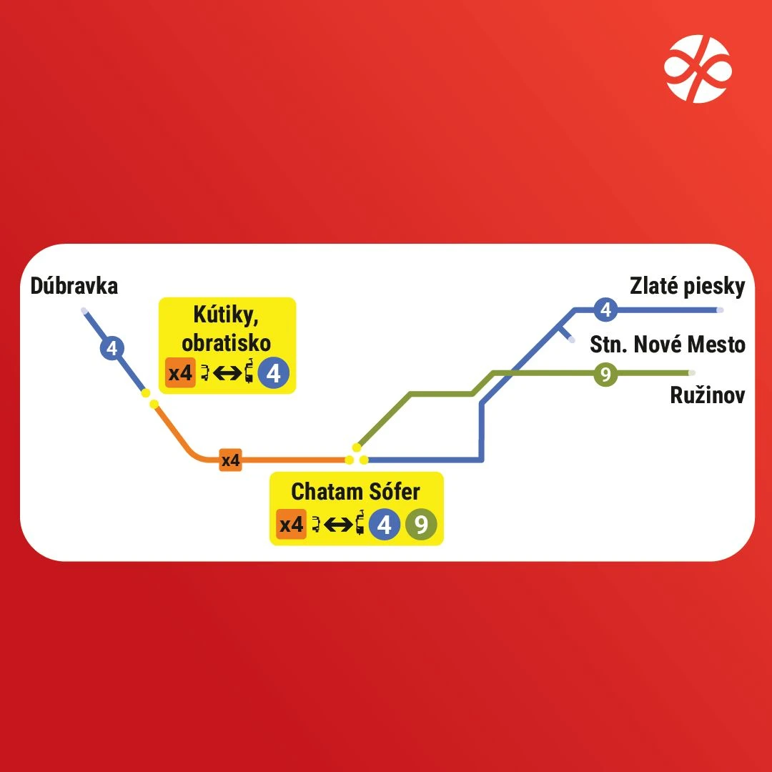 Linka 9 v opačnom smere pôjde z Ružinova po svojej bežnej trase až na zastávku Chatam Sófer, odkiaľ sa bude vracať ako linka 4 cez Nábrežie, Centrum, Špitálsku a Trnavské mýto až na Zlaté piesky alebo Stanicu Nové Mesto. Na spomínanom úseku budú premávať náhradné autobusy X4, ktoré zastavia na všetkých zastávkach, okrem zastávky Svrčia.