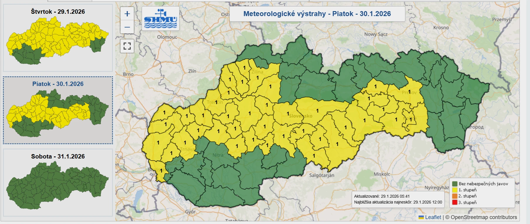 V Bratislavskom kraji platí na štvrtok a piatok výstraha 1. stupňa pred poľadovicou. Ojedinelá tvorba poľadovice sa očakáva od štvrtka 29. januára od 18.00 h do piatka 30. januára do 10.00 h. Zľadovatené povrchy môžu predstavovať riziko pre dopravu, chodcov aj technickú infraštruktúru. Výskyt poľadovice je v tomto období bežný, no môže spôsobiť škody menšieho rozsahu.