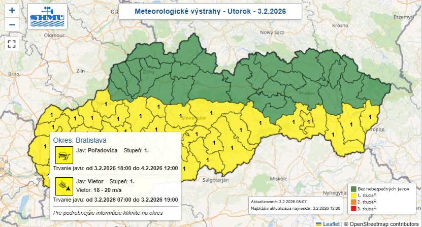 Obyvateľov hlavného mesta čaká v utorok nepríjemná kombinácia vetra, zrážok a neskôr aj poľadovice. Meteorológovia vydali pre okres Bratislava výstrahy 1. stupňa, ktoré upozorňujú na možné riziká pre dopravu aj bežné aktivity vonku.