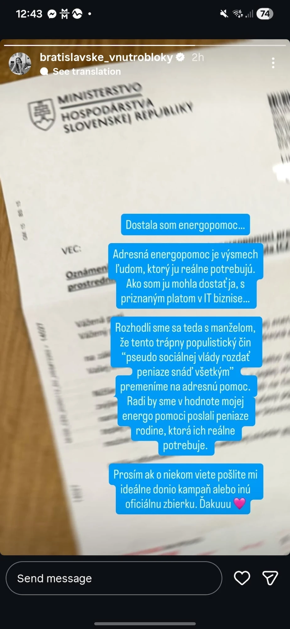 „Adresná energopomoc je výsmech ľuďom, ktorí ju reálne potrebujú. Ako som ju mohla dostať ja, s priznaným platom v IT biznise? Rozhodli sme sa teda s manželom, že tento trápny populistický čin pseudosociálnej vlády rozdať peniaze všetkým premeníme na adresnú pomoc. Radi by sme v hodnote mojej energo pomoci poslali peniaze rodine, ktorá ich reálne potrebuje,“ napísala v instagramovom príbehu. Svojich sledovateľov zároveň vyzvala, ak vedia o nejakej zbierke či rodine v núdzi, aby jej o tom dali vedieť.