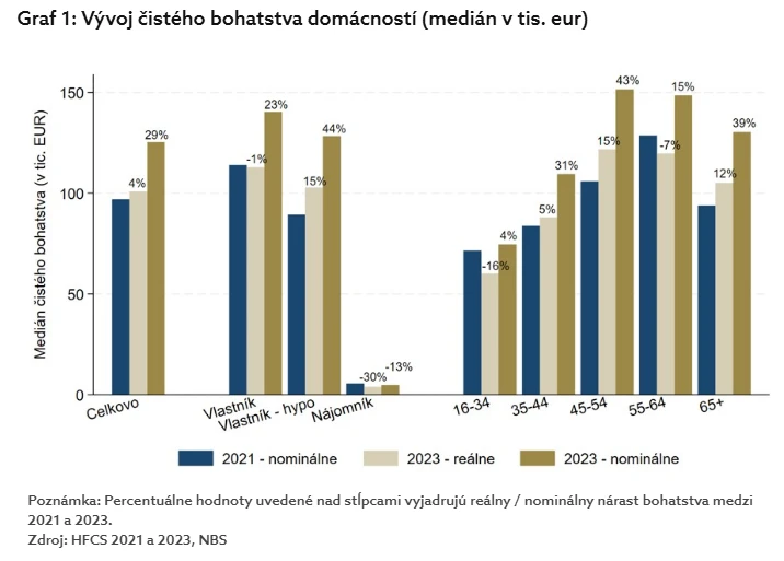 Údaje zároveň ukazujú rastúcu nerovnosť. Najbohatších 10 percent domácností vlastnilo v roku 2023 takmer 36 percent celkového bohatstva, zatiaľ čo v roku 2021 to bolo 33 percent. Výrazne lepšie sú na tom vlastníci bývania a staršie domácnosti, najviac pod tlakom zostávajú mladí a nájomníci.