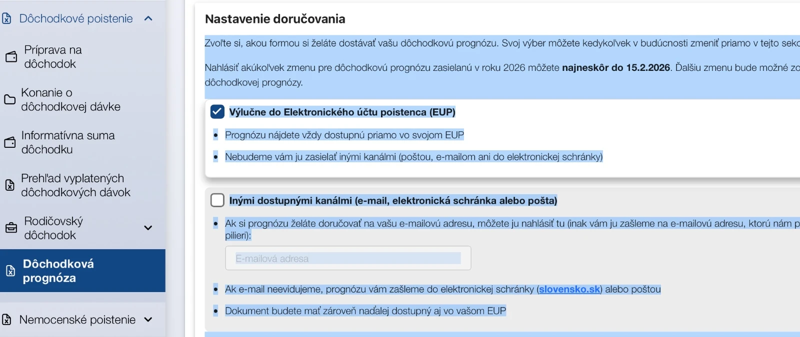 Poistenci si môžu spôsob doručovania dôchodkovej prognózy zvoliť najneskôr do 15. februára 2026. Majú možnosť nastaviť doručovanie výlučne do Elektronického účtu poistenca (EUP) alebo na nimi nahlásenú e-mailovú adresu. Ak si zvolia doručovanie výlučne do EUP, Sociálna poisťovňa im prognózu už nebude zasielať poštou, e-mailom ani do elektronickej schránky. Ak poistenec voľbu neurobí, poisťovňa mu prognózu zašle na oznámenú e-mailovú adresu, prípadne na e-mail evidovaný v dôchodkovej správcovskej spoločnosti, ak ide o sporiteľa v druhom pilieri. Ak nebude mať k dispozícii e-mail, doručí ju do aktivovanej elektronickej schránky alebo klasickou poštou. Dôchodková prognóza bude vždy dostupná aj v Elektronickom účte poistenca, ktorý si už aktivovalo viac ako pol milióna poistencov.