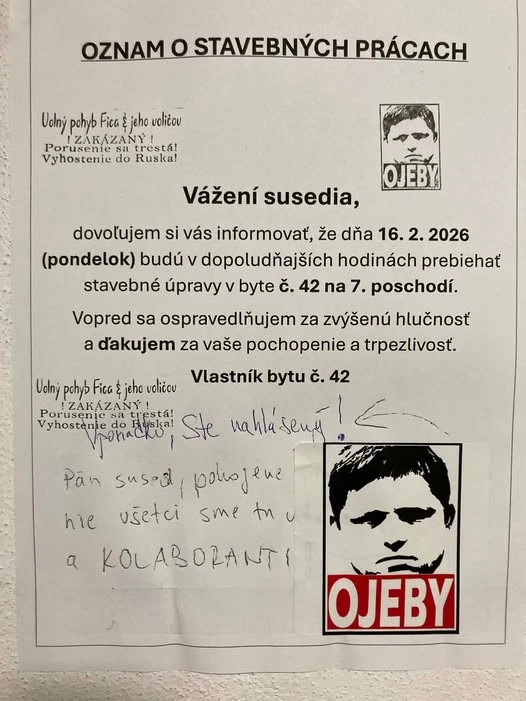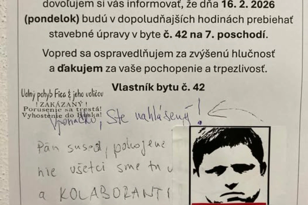 Navonok bežný a nevinný susedský oznam v jednom z bratislavských panelákov sa začal šíriť sociálnymi sieťami po tom, čo ho zdieľal novinár a šéfredaktor portálu Aktuality.sk Peter Bárdy. Nalepili ho susedia, ktorí chceli vopred upozorniť ostatných, že ich čakajú stavebné práce. Svoje plány oznámili slušne textom v znení : Vážení susedia, dovoľujem si vás informovať, že dňa 16. 2. 2026 (pondelok) budú v dopoludňajších hodinách prebiehať stavebné úpravy v byte č. 42 na 7. poschodí. Vopred sa ospravedlňujem za zvýšenú hlučnosť a ďakujem za vaše pochopenie a trpezlivosť.
