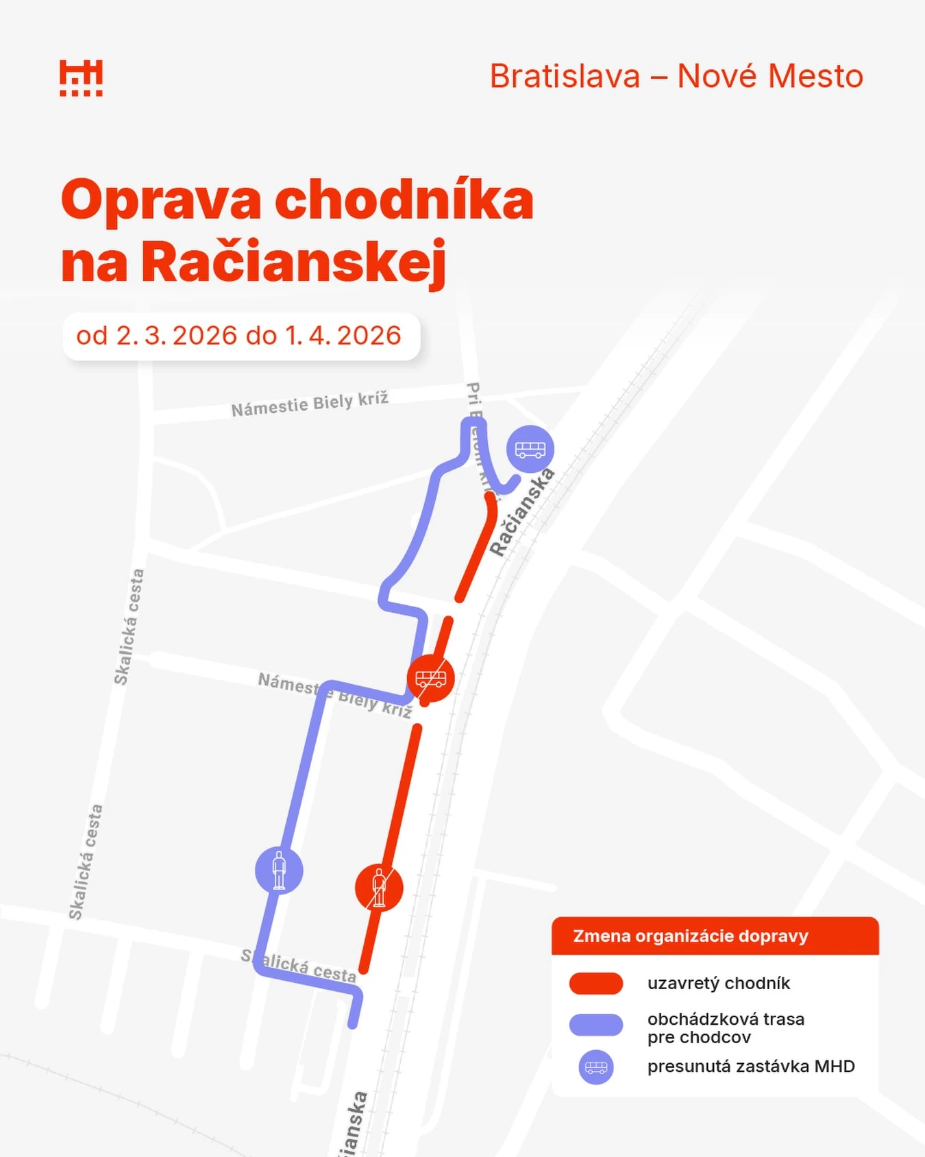 Na jednej z najvyťaženejších bratislavských ulíc sa už o pár dní rozbehnú stavebné stroje. Hlavné mesto oznámilo, že od 2. marca 2026 začne s opravou chodníka na Račianskej ulici v úseku od Námestia Biely kríž po Skalickú cestu. Práce potrvajú približne do začiatku apríla a prinesú so sebou dočasné obmedzenia pre chodcov aj cestujúcich MHD.
