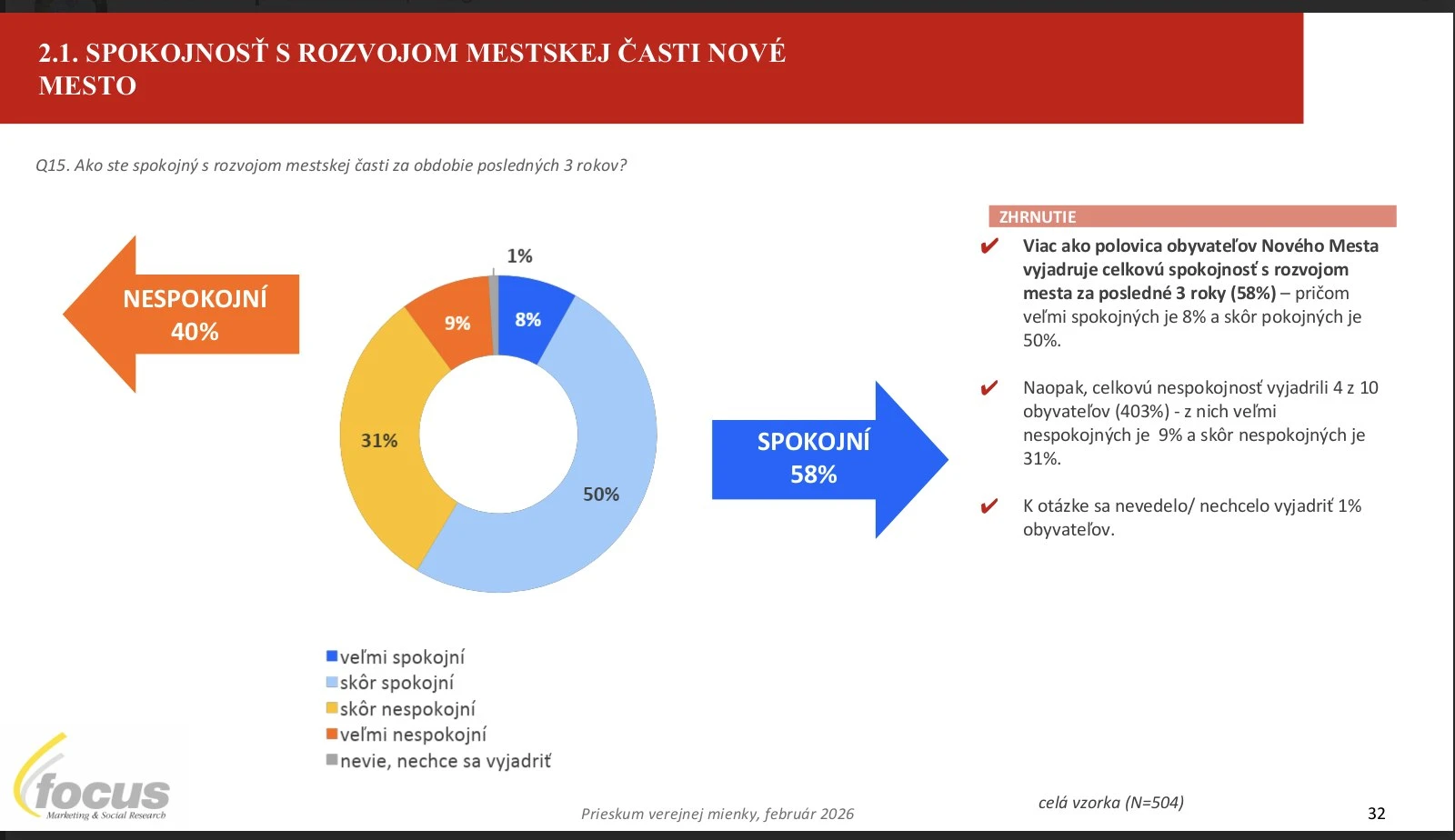 Prieskum medzi obyvateľmi Nového Mesta ukázal, že 58 % je spokojná s rozvojom mestskej časti za posledné tri roky. Starosta Matúš Čupka upozorňuje, že výsledky sa líšia od názorov na sociálnych sieťach.