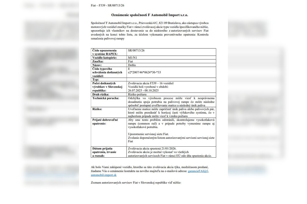 Najmenší počet dotknutých vozidiel eviduje značka Fiat. Ide o model Fiat Doblo (vyrobený v roku 2025), kde môže dôjsť k úniku paliva a následnému riziku požiaru.