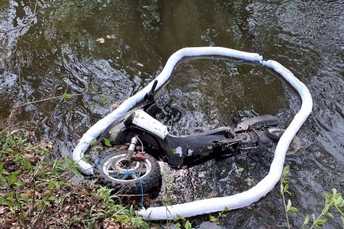 Motocykel po náraze skončil v Zohorskom kanáli. Hasiči zabránili úniku prevádzkových kvapalín do vody pomocou sorpčných prostriedkov a po zdokumentovaní nehody ho z kanála vytiahli.