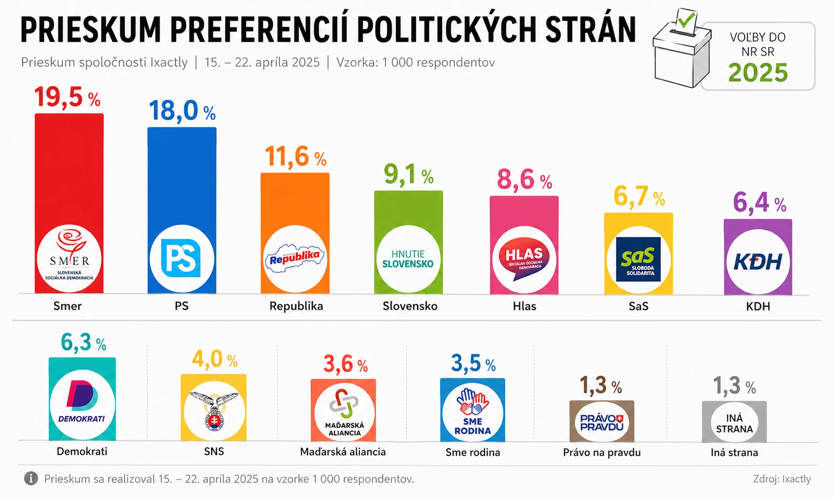 Prieskum spoločnosti Ixactly pre Markízu ukazuje, že Smer aj PS sa pohybujú okolo hranice 20 percent. Na treťom mieste sa umiestnila Republika s viac ako jedenástimi percentami. Výrazný prepad zaznamenal Hlas, ktorý sa pohybuje približne na úrovni šiestich percent, podobne ako SaS, KDH či Demokrati.
