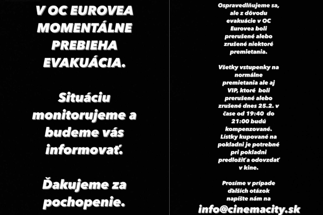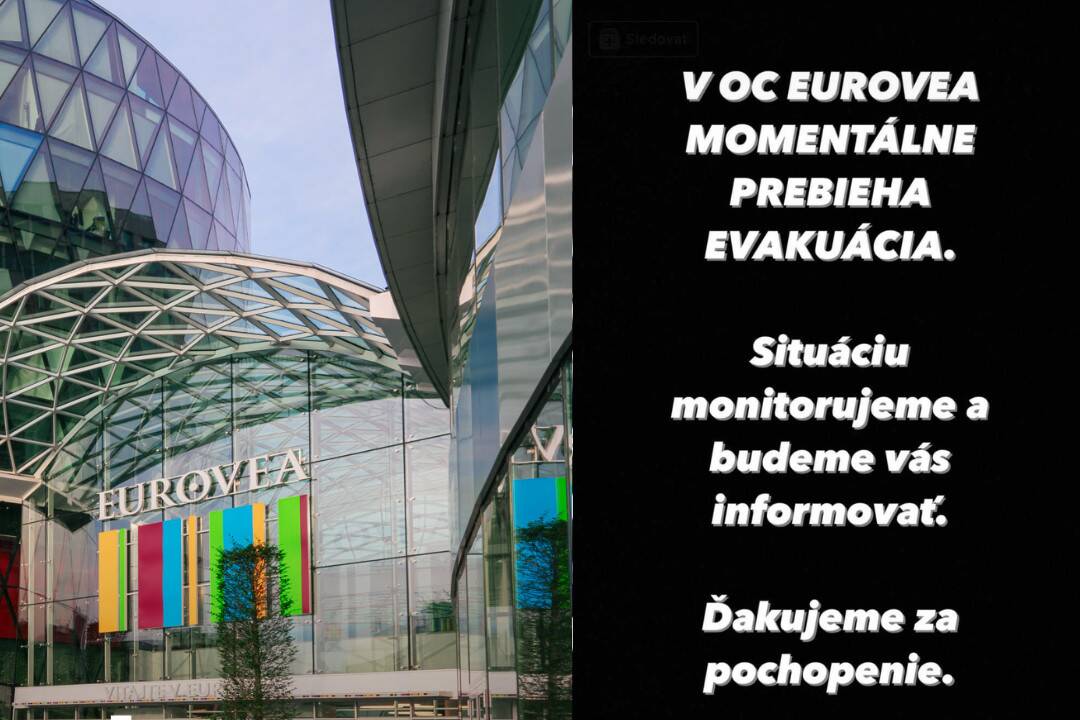 V bratislavskom obchodnom centre Eurovea v nedeľu prebehla evakuácia. Informovalo o tom kino CinemaCity na sociálnej sieti. Z dôvodu evakuácie boli zrušené alebo prerušené viaceré premietania.