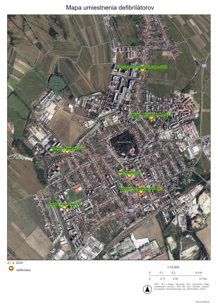 V prípade núdze ich obyvatelia nájdu na budove Pezinského kultúrneho centra na Holubyho ulici, pri Materskej škole gen. Pekníka, v Dennom centre na Cajlanskej ulici, pri novej pumptrackovej dráhe na Fajgalskej ceste a na plavárni na Komenského ulici. Mestským defibrilátorom zároveň disponuje aj Mestský úrad na Radničnom námestí.