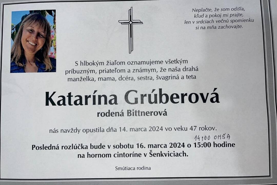 Posledná rozlúčka so zosnulou Katarínou sa uskutoční dnes 16. marca o 14:00 hod. spoločne s omšou na hornom cintoríne v Šenkviciach na Trlínskej ulici.