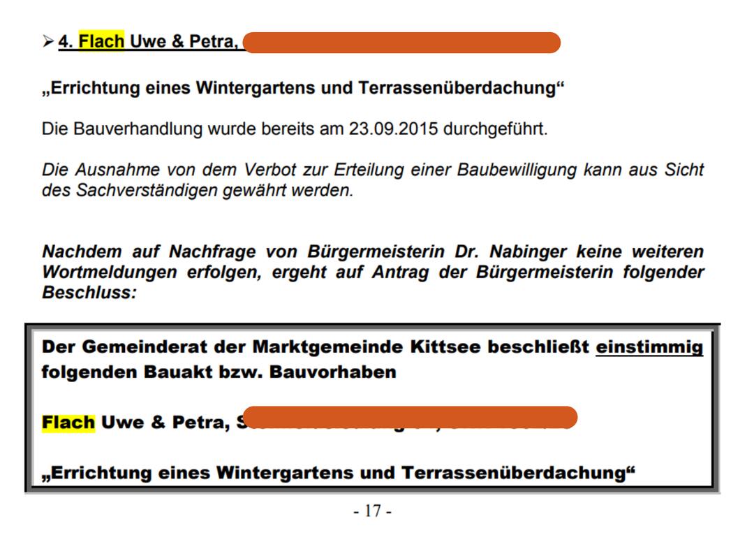 Okrem toho jej pohyb v rakúskej Kittsee dokazujú aj stavebné povolenia. V septembri 2015 bolo vypísané stavebné povolenie pre výstavbu zimnej záhrady a zastrešenie terasy.