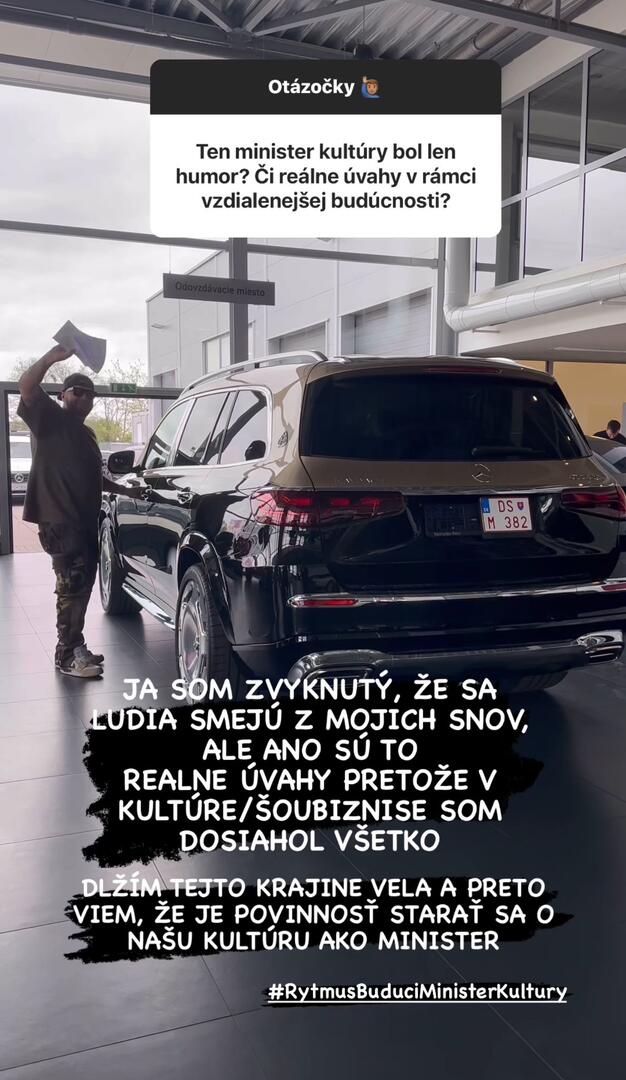 Stane sa raper ministrom kultúry? Rytmus s manželkou neprestávajú posledné dni prekvapovať, a raper najnovšie prezradil na sociálnej sieti svoje veľké plány. Či ide o vtip, alebo skutočné úvahy posúďte sami. Spevák tvrdí, že ide o skutočný plán. „Ja som zvyknutý, že sa ľudia smejú z mojich snov, ale áno, sú to reálne úvahy, pretože v kultúre/šoubiznise som dosiahol všetko. Dlhujem tejto krajine veľa, a preto viem, že je povinnosť starať sa o našu kultúru ako minister,“ napísal v instagramovom príbehu.
