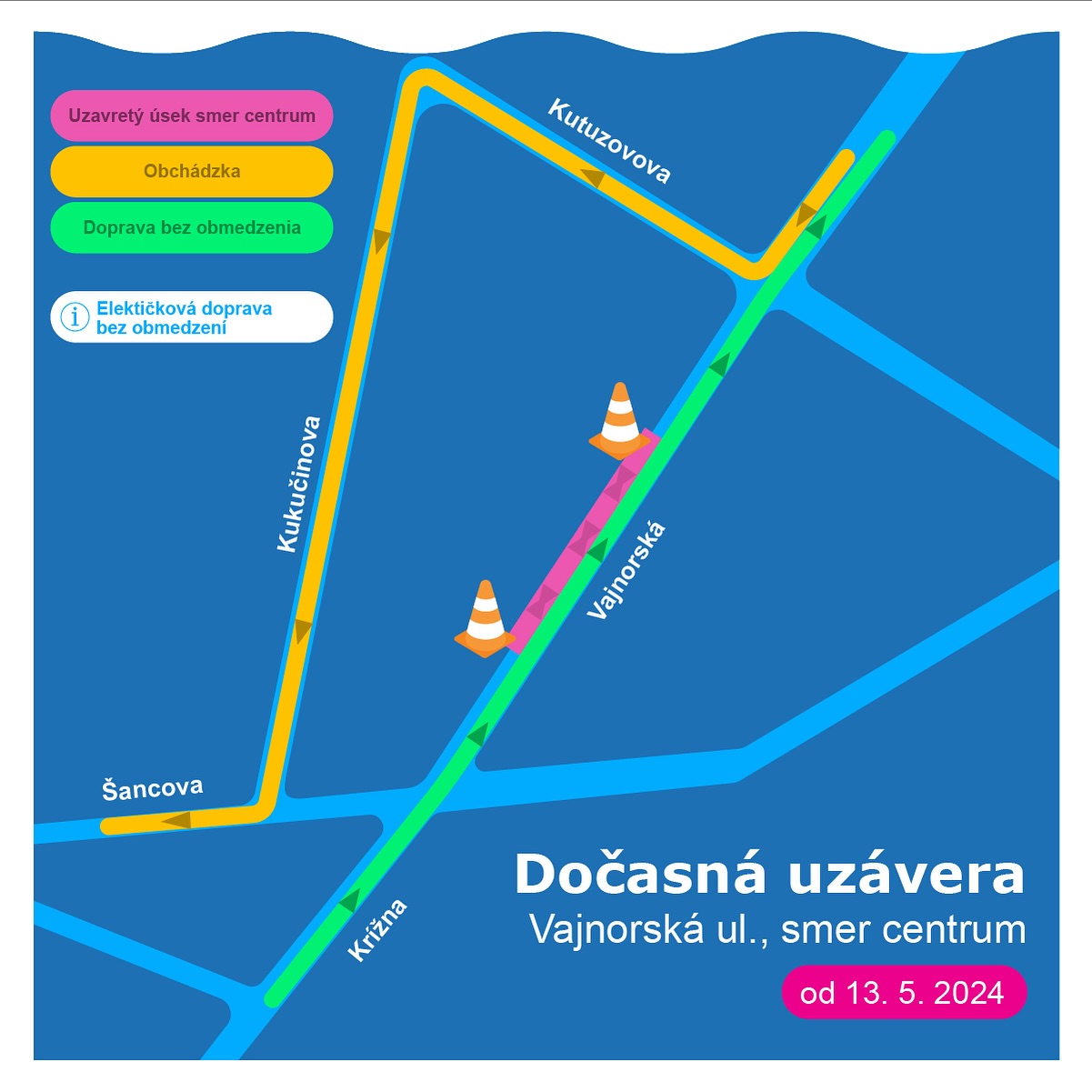 Obchádtková trasa v smere na Trnavské mýto vedie po Kutuzovovej ulici. V smere na Krížnu je potrebné použiť trasu z Vajnorskej na Bajkalsú ulicu a následne z Trnavskej cesty odbočiť na Krížnu. Obmedzenie sa týka len smeru do centra mesta, opačný smer nie je rekonštrukciou ovplyvnený. Zmena dopravy sa zároveň len minimálne dotkne MHD - autobusová linka N53 je obsluhovaná na električkovej zastávke Česká a autobusová zastávka Česká nie je obsluhovaná. Električky celým úsekom naďalej premávajú.