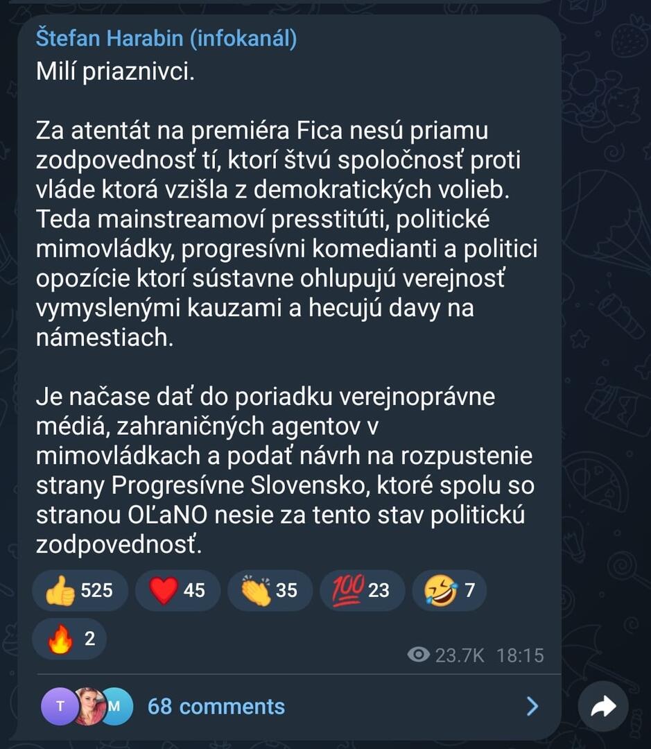 Po emotívnych reakciách politikov na atentát Roberta Fica prišla rázna reakcia bývalého sudcu a neúspešného kandidáta za prezidenta Štefana Harabina. Na svojom Telegrame napísal, že treba podať návrh na rozpustenie Progresívneho Slovenska.
