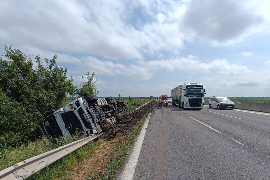 Na D1 smerom na Bratislavu sa prevrátil kamión s drevom. Polícia odklonila dopravu