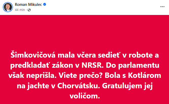 „Medzitým sa však našla - na jachte s poslancom Kotlárom. Je neuveriteľné, kam až môže zájsť arogancia a bohorovnosť nominantov SNS, ktorí si verejné funkcie očividne mýlia s feudálnymi titulmi. Zdá sa, že odvolávanie ministerky kultúry bude mať ďalšie pokračovanie.“