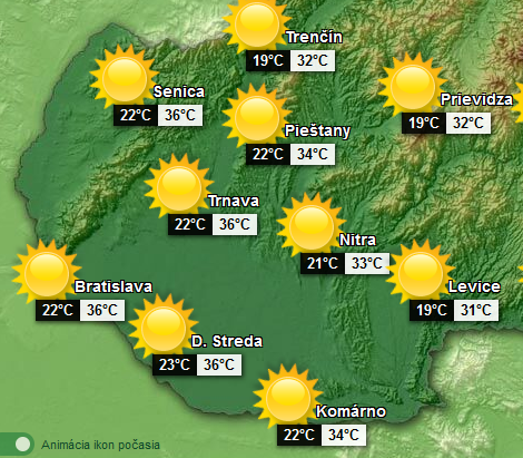 Pondelok môžeme pokojne označiť za prvý tropický deň. SHMÚ uvádza, že teploty by mali dosiahnuť 28 stupňov. To všetko len s minimálnou oblačnosťou a slabým vetrom. Tieto faktory taktiež prispievajú k pocitu horúčavy.
