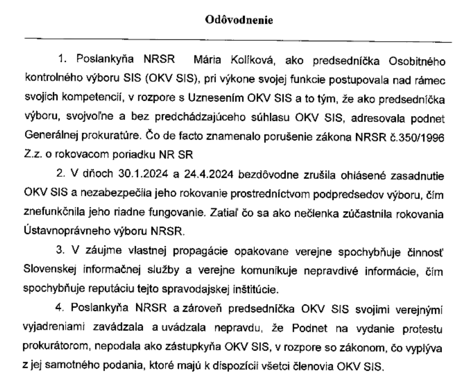 Návrh na odvolanie Márie Kolíkovej z čela výboru pre kontrolu SIS podal poslanec Hlasu-SD a bývalý novinár TV JOJ Samuel Migaľ. Keď vzniklo podozrenie, že mal Gašpar lustrovať novinárov, aj figurovalo medzi nimi aj Migaľovo meno. Kolíková mala podľa neho podať podnet na Generálnu prokuratúru proti rokovaciemu poriadku a nad rámec svojich kompetencií. Kolíkovej vyčíta, že verejne spochybňuje činnosť SIS.