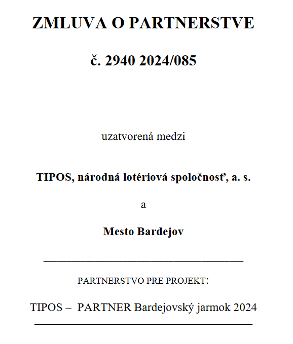 Spoločnosť Tipos uzatvorila zmluvu s mestom Bardejov 9. júla a o dva dni neskôr bola zverejnená v centrálnom registri zmlúv. Ide o partnerstvo pre projekt Tipos - partner Bardejovský jarmok 2024. Štátna akciovka podporí jarmok v Bardejove sumou 25-tisíc eur.