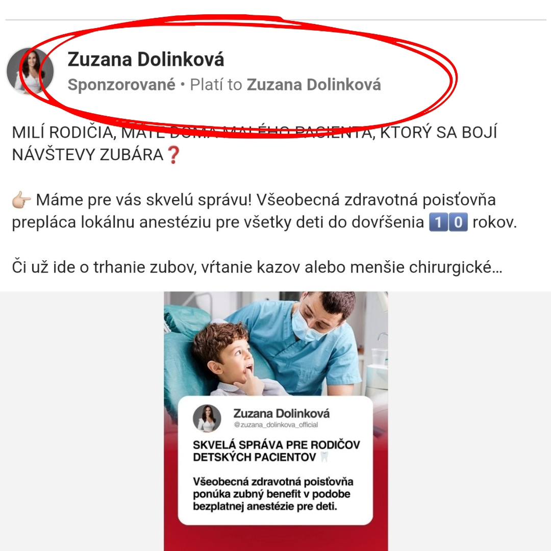 Opozičná SaS najnovšie upozornila aj na to, že reklama pre Všeobecnú zdravotnú poisťovňu bola na Facebooku platená cez profil Zuzany Dolinkovej. Príspevok sa týkal nového zubného benefitu poisťovne vo forme bezplatnej anestézie pre deti.