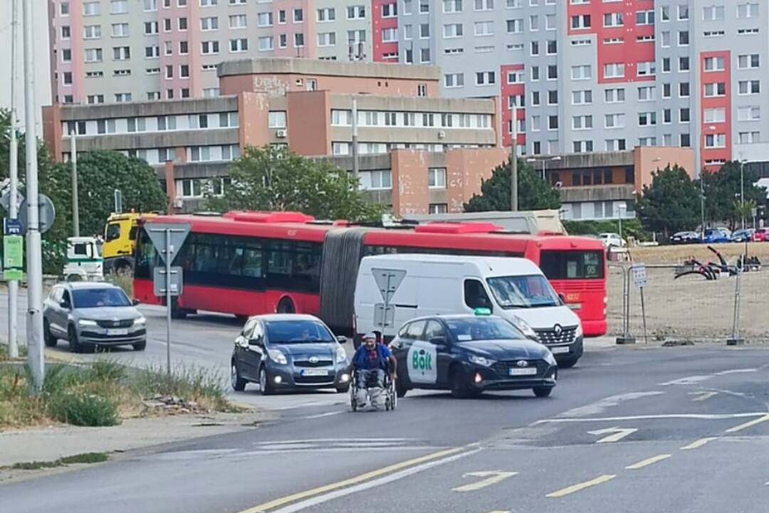 Muž na vozíku blokuje dopravu v Petržalke. Vraj ide o človeka bez domova a býva v stane pri Inchebe