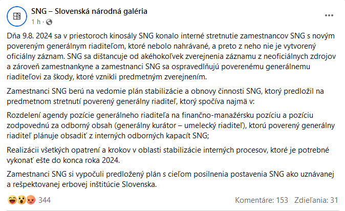 „Dňa 9.8. 2024 sa v priestoroch kinosály SNG konalo interné stretnutie zamestnancov SNG s novým povereným generálnym riaditeľom, ktoré nebolo nahrávané, a preto z neho nie je vytvorený oficiálny záznam. SNG sa dištancuje od akéhokoľvek zverejnenia záznamu z neoficiálnych zdrojov a zároveň zamestnankyne a zamestnanci SNG sa ospravedlňujú poverenému generálnemu riaditeľovi za škody, ktoré vznikli predmetným zverejnením,“ píše sa vo vyhlásení.