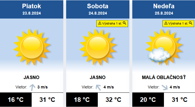 Slovenský hydrometeorologický ústav vydal na nadchádzajúcu sobotu a nedeľu výstrahu 1. stupňa pred vysokými teplotami. „Vysoká teplota predstavuje potenciálne nebezpečenstvo pre ľudské zdravie, fyzické aktivity a tvorbu požiarov. Uvedená teplota vzduchu nie je v danej ročnej dobe a oblasti nezvyčajná, ale pravdepodobnosť nadmerného zaťaženia organizmu u niektorých osôb je vysoká,“ píše SHMÚ.
