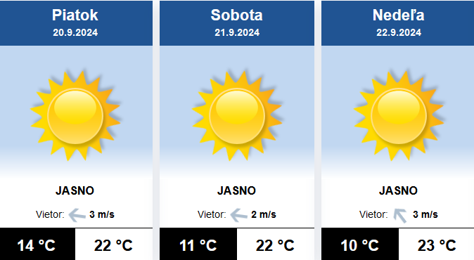 Predpoveď počasia je priaznivá na najbližšie dni. Na západe Slovenska bude slnečno a teplo. Slovenský hydrometeorologický ústav informuje, že denné teploty sa budú cez víkend, ale aj v pondelok pohybovať na hodnotách 22 až 23 stupňov celzia.