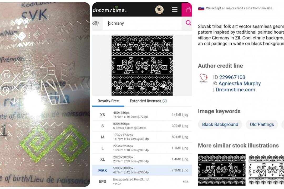 Časť dizajnu však pochádza z fotobanky Dreamstime, kde si ho vie stiahnuť každý zadarmo. Ministerstvo použilo dizajn od poľskej grafičky Agnieszky Murphy, ktorá je inšpirovaný vzormi na domčekoch v Čičmanoch. Slovenský folklór bez fajku tvrdí, že dizajn slovenských pasov by mal vytvoriť renomovaný umelec, nie fotobanka.