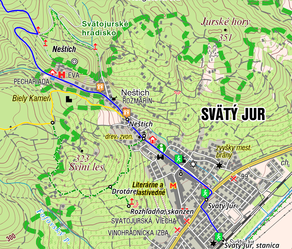 Zaujímavá túra počas ktorej si vychutnáte prírodné krásy Malých Karpát, ale aj spoznáte historické pamiatky v okolí Svätého Jura. Trasa sa začína na železničnej stanici vo vinohradníckom mestečku a pokračuje centrom Svätého Jura. Na námestí budete míňať typické historické domy z 18. a 19. storočia a nazrieť môžete aj do gotického kostola sv. Juraja.