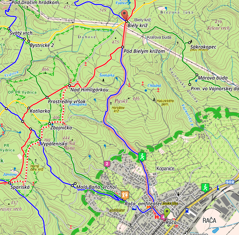 Obľúbená trasa bratislavských výletníkov, ale aj cyklistov. Modrá značka sa začína v Rači a povedie vás až na Biely kríž, kde je možnosť občerstvenia. Východiskom na prechádzku, ktorá je vhodná aj pre deti však môže aj parkovisko na začiatku lesa tesne za poslednými račianskymi domami. To však býva predovšetkým počas víkendov plné.