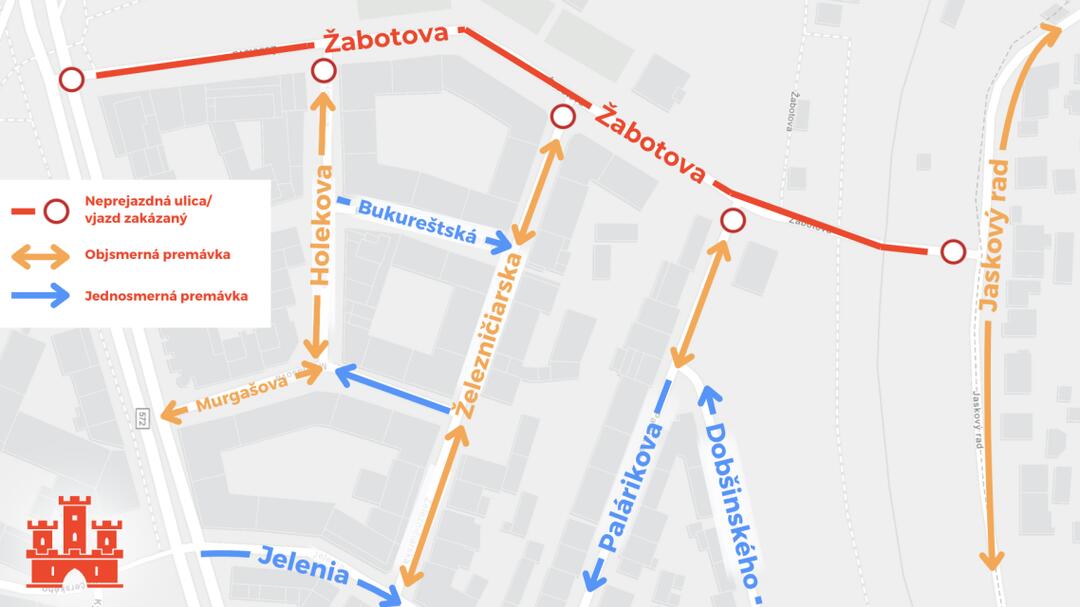 Počas prác bude Žabotova ulica úplne uzavretá a neprejazdná, chodníky však ostanú pre chodcov prístupné. Rovnako bude platná aj dočasná zmena organizácie dopravy na uliciach Železničiarska, Holekova a časti Murgašovej ulice, kde bude umožnená obojsmerná premávka.