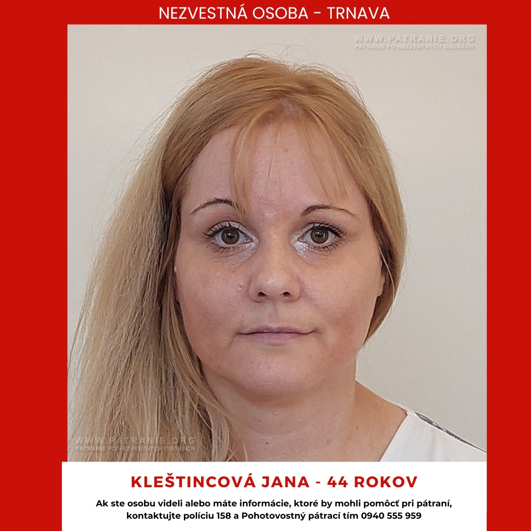 Po 44-ročnej Jane Kleštincovej pátranie vyhlásili policajti z Trnavy. Žena z miesta bydliska odišla v utorok 29. októbra o pol piatej ráno do práce. Vtedy ju videli naposledy.