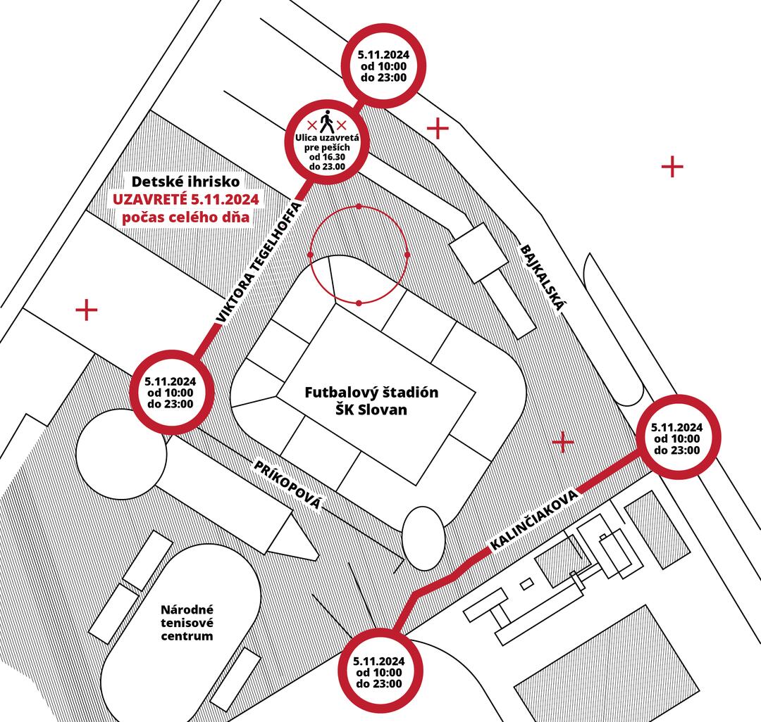 V čase od 10:00 do 23:00 hod. budú pre osobnú automobilovú dopravu uzavreté ulice Viktora Tegelhoffa v celej dĺžke a Kalinčiakova ulica od administratívnej budovy TOWER 5 po Bajkalskú ulicu. Od 16:30 nebude do ulice Viktora Tegelhoffa možný vstup ani pre peších, Kalinčiakova ulica bude pre peších dostupná a pre futbalových fanúšikov tam bude od 16:00 hod. pripravená Fanzóna. Počas tohto časového obdobia nebude možný ani prejazd ulicami.